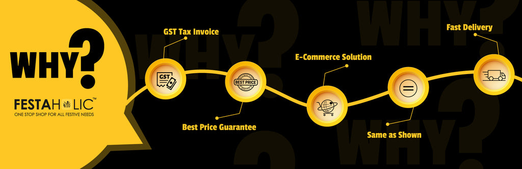 To fill this gap, we came up with an organised and smooth platform to fulfil all your festival item needs at one place, with more than 10,000 SKUs covering all Indian festivals and occasions. We have enough stock with us to give you a better price than unorganised market sellers with desired designs, colour options, and the same order quantity and variants as shown. So shop with confidence with us to get the same defect-free and premium-quality products.