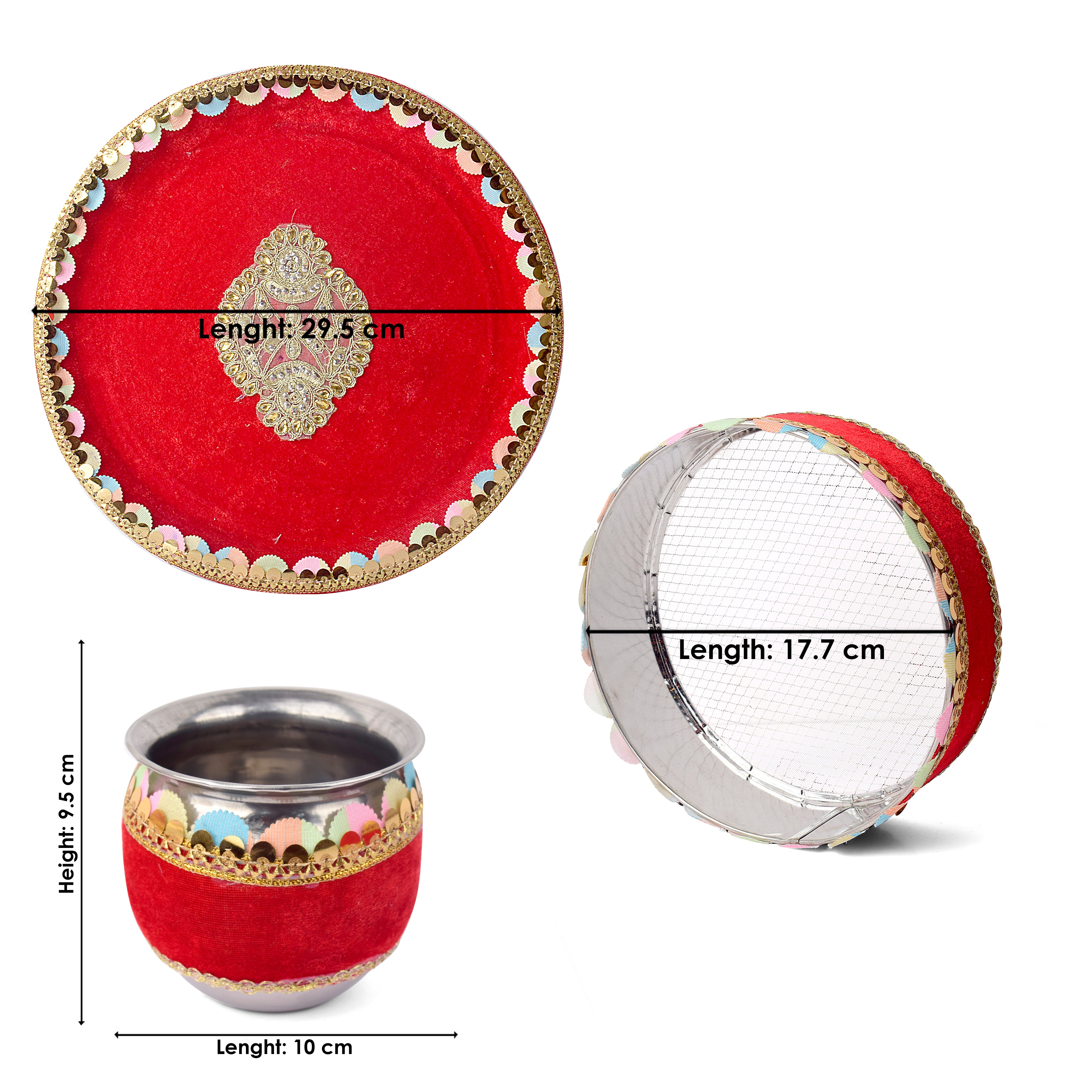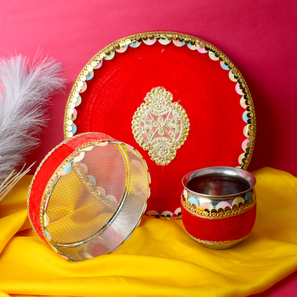 Product Name - Designer Red Velvet Thali for Pooja