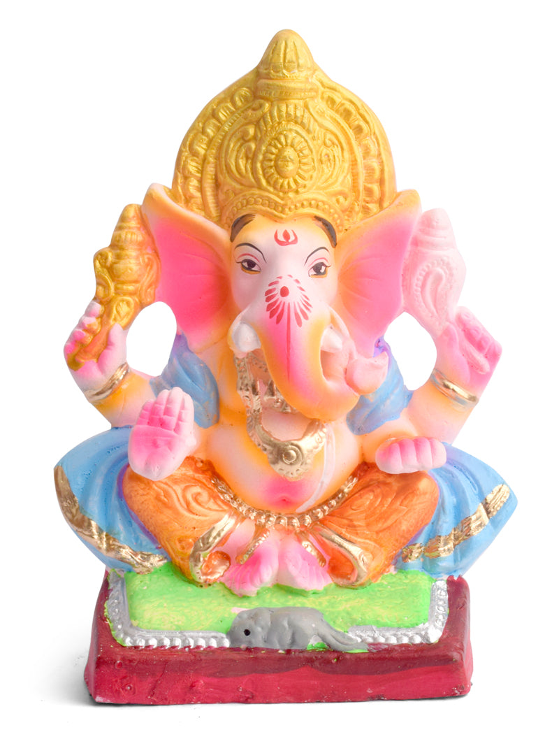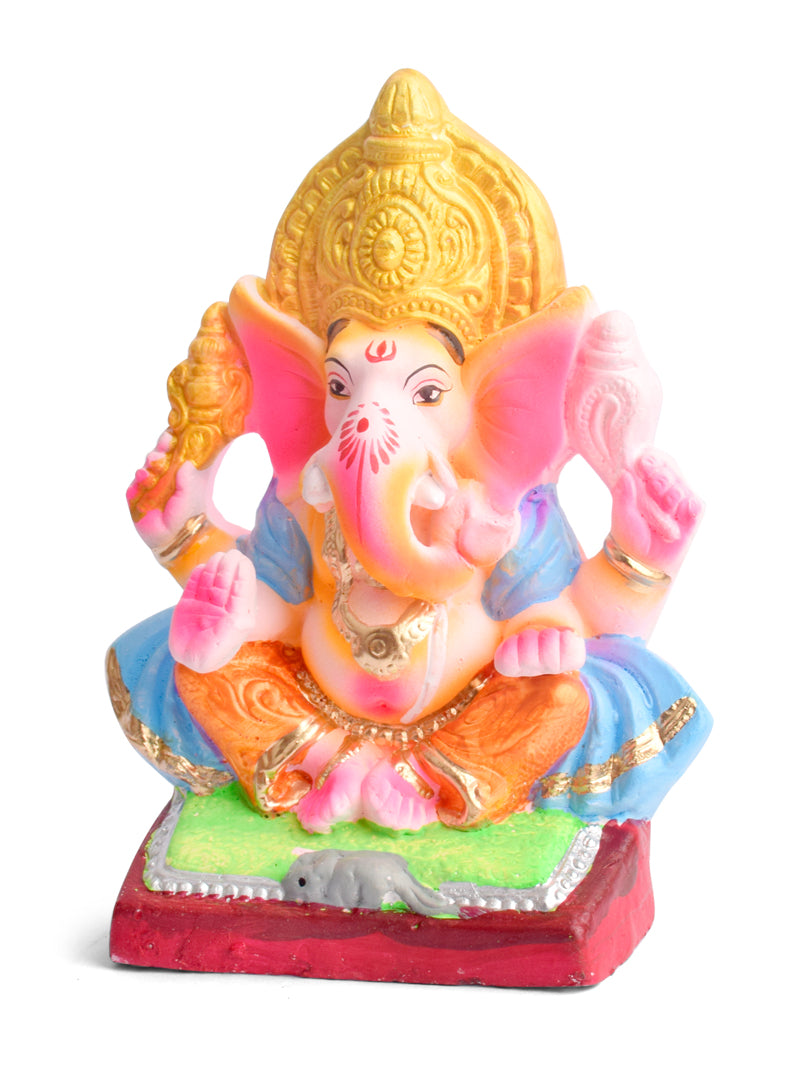 Product Name - 8 Inch Yadhvasin Eco-Friendly Ganesha Idol in Gajanan Pose with Sky Blue Patka